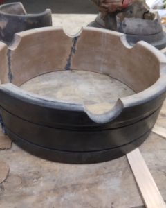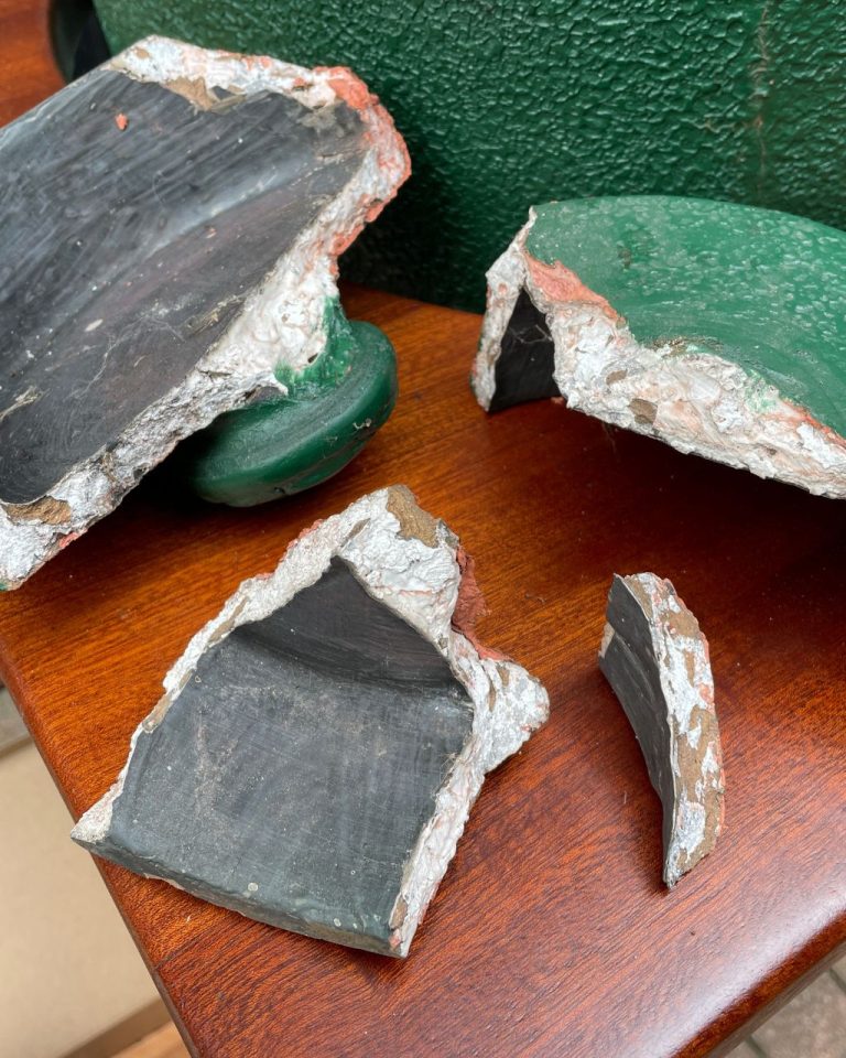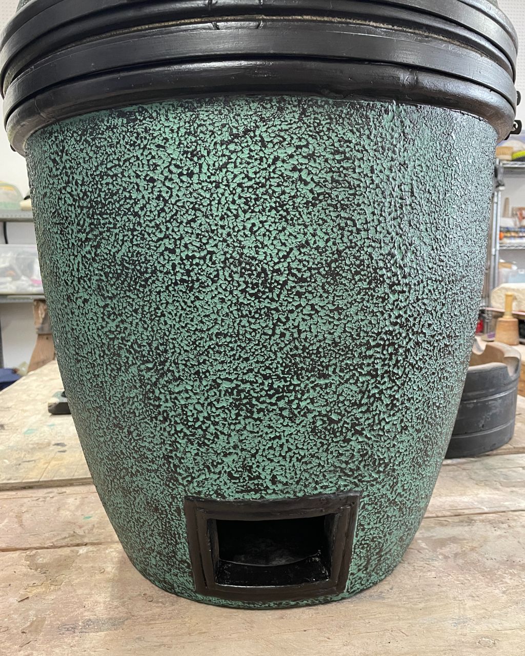 Following structural stabilization, efforts shifted to restoring the Kamado’s authentic aesthetic. Historical research and physical evidence suggested that the original finish consisted of a light aqua/marine green glaze with contrasting black raised textures. The restoration process included:
