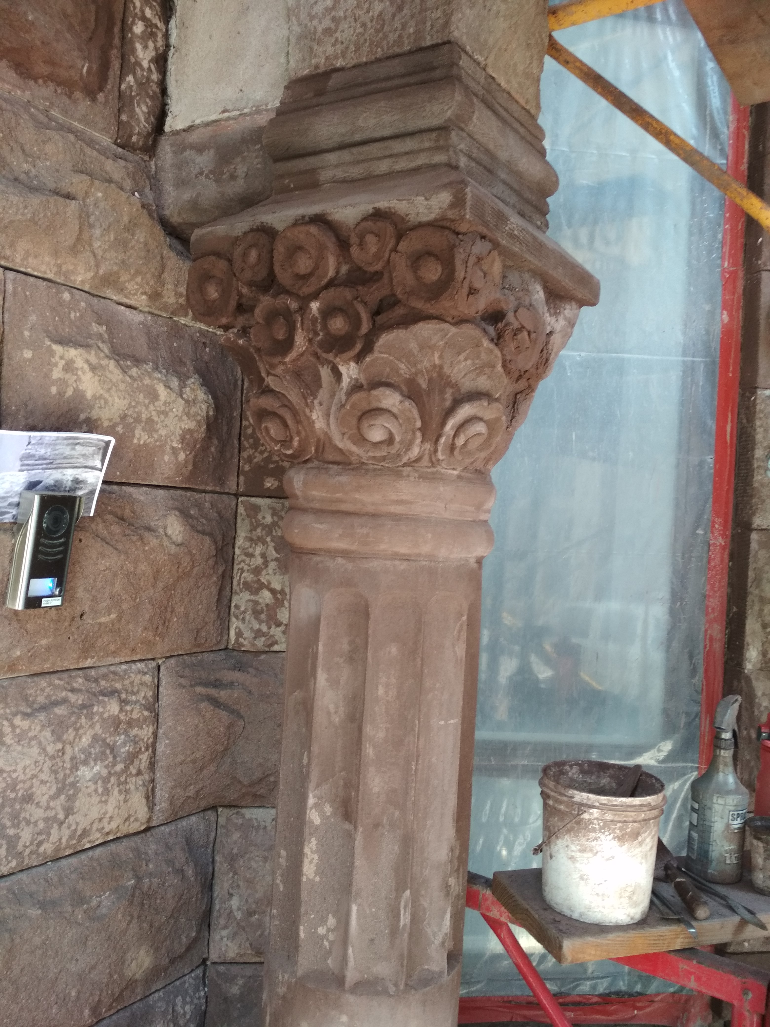 A major challenge was sourcing replacement stone that matched the original red sandstone was used in the 1890s. Since no local quarry produced an exact match, the team turned to lab-fabricated stone, guided by: