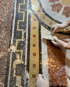 Reinstallation was the final and most intricate phase of the project. Some sections of tesserae were reassembled off-site using our mapping process and relaid in larger segments, while others were carefully installed one by one. Custom-fabricated tesserae were seamlessly integrated into the original design, ensuring a cohesive and historically accurate restoration.