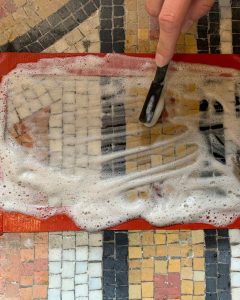 Cleaning was a delicate but essential part of the restoration process. We removed incrustations and mineral deposits using non-abrasive techniques, revealing the vibrant colors and intricate patterns hidden beneath years of buildup. This step not only restored the mosaic’s aesthetic appeal but also prepared the surface for reinstallation.