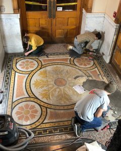 When we began restoring the mosaic floor at the Hackley Public Library in Muskegon, Michigan, we uncovered more than just a damaged work of art—we unearthed a rich piece of history waiting to be preserved. This hand-cut stone mosaic, a stunning feature of the historic library, had suffered decades of wear and structural instability. Despite its condition, its beauty and cultural significance were undeniable.